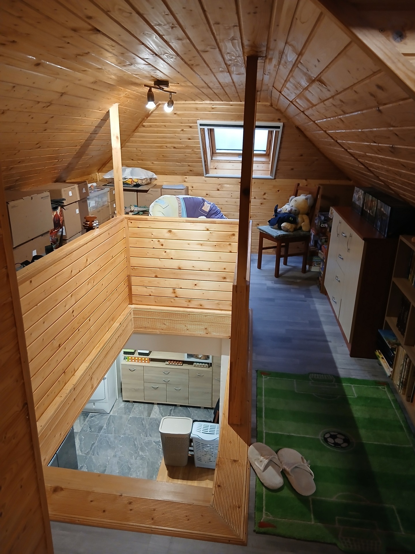 A 3 hálószoba, a konyha-étkező, a fürdőszoba, a WC és egy előszoba a földszinten található, a hangulatos nappali a tetőtérben került kialakításra.