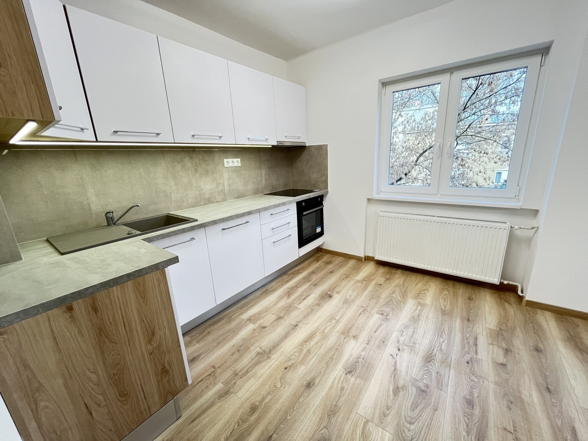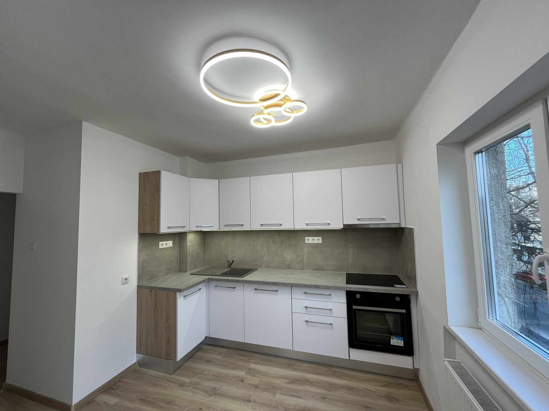 - új konyhabútorban csillapított csukódású pántok és önbehúzó vasalatok, led világítás a felső szekrényben, kőburkolat a falon