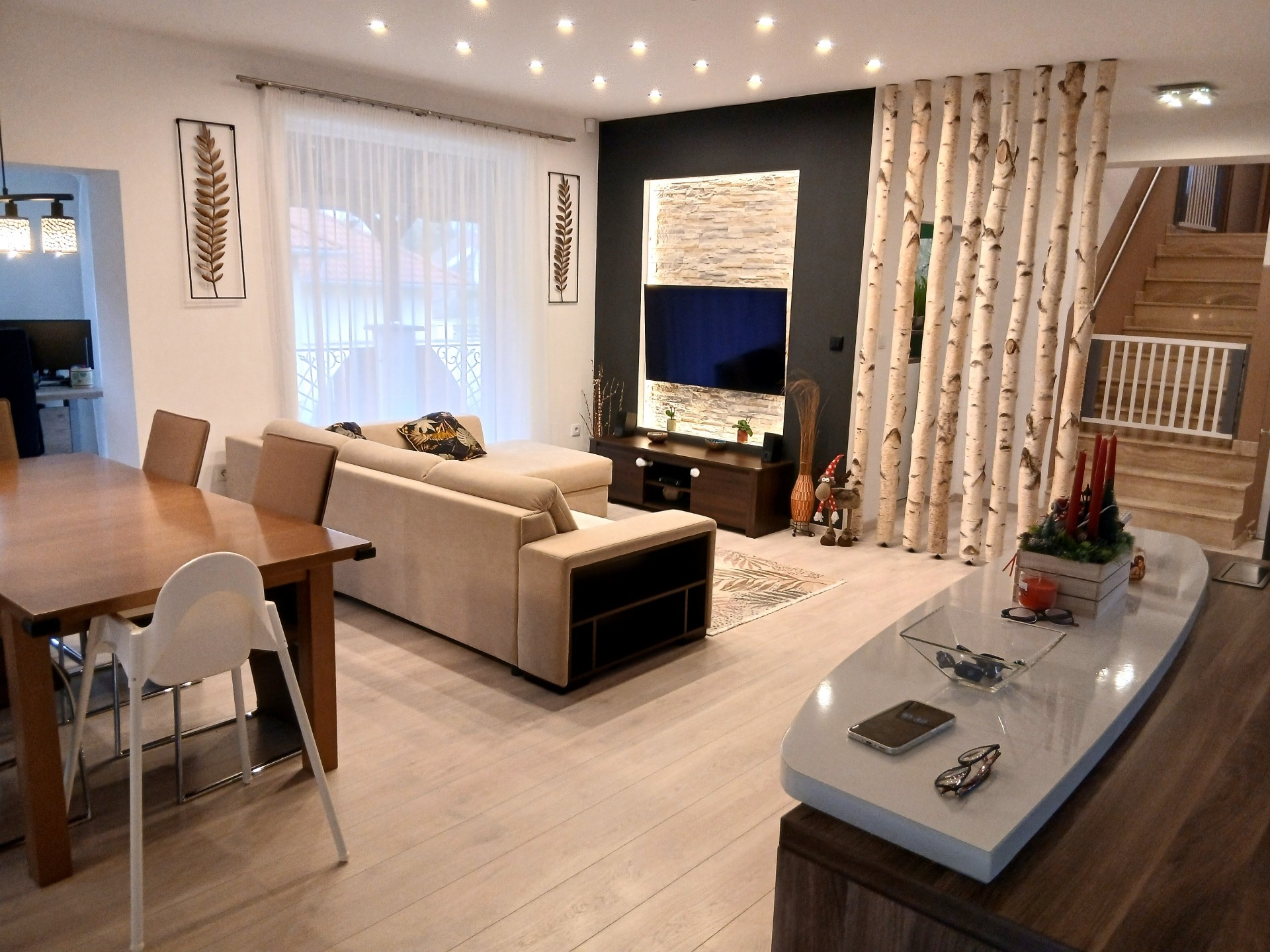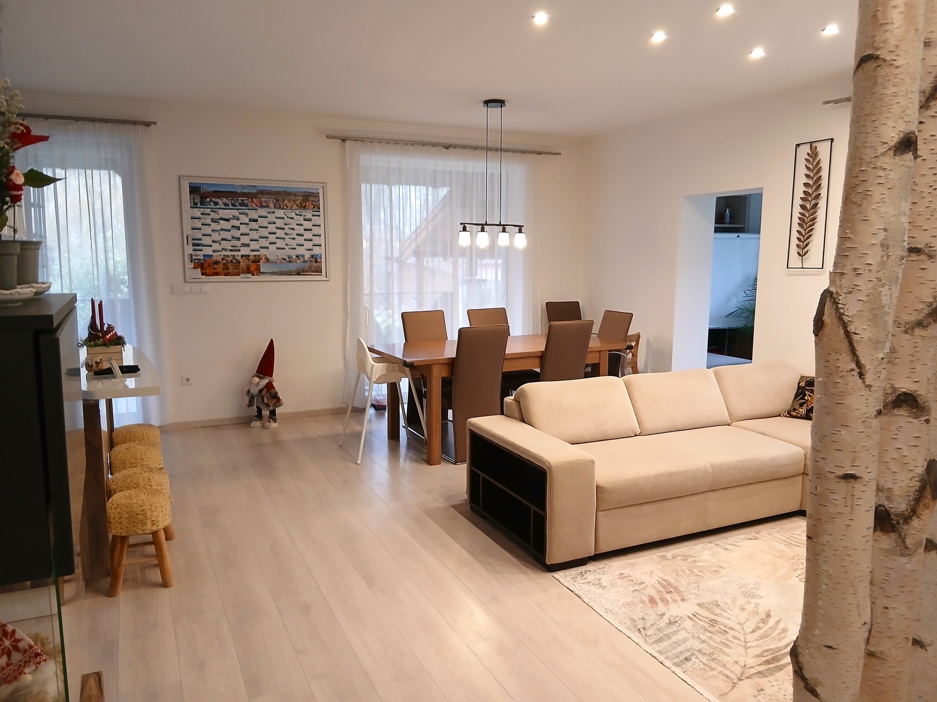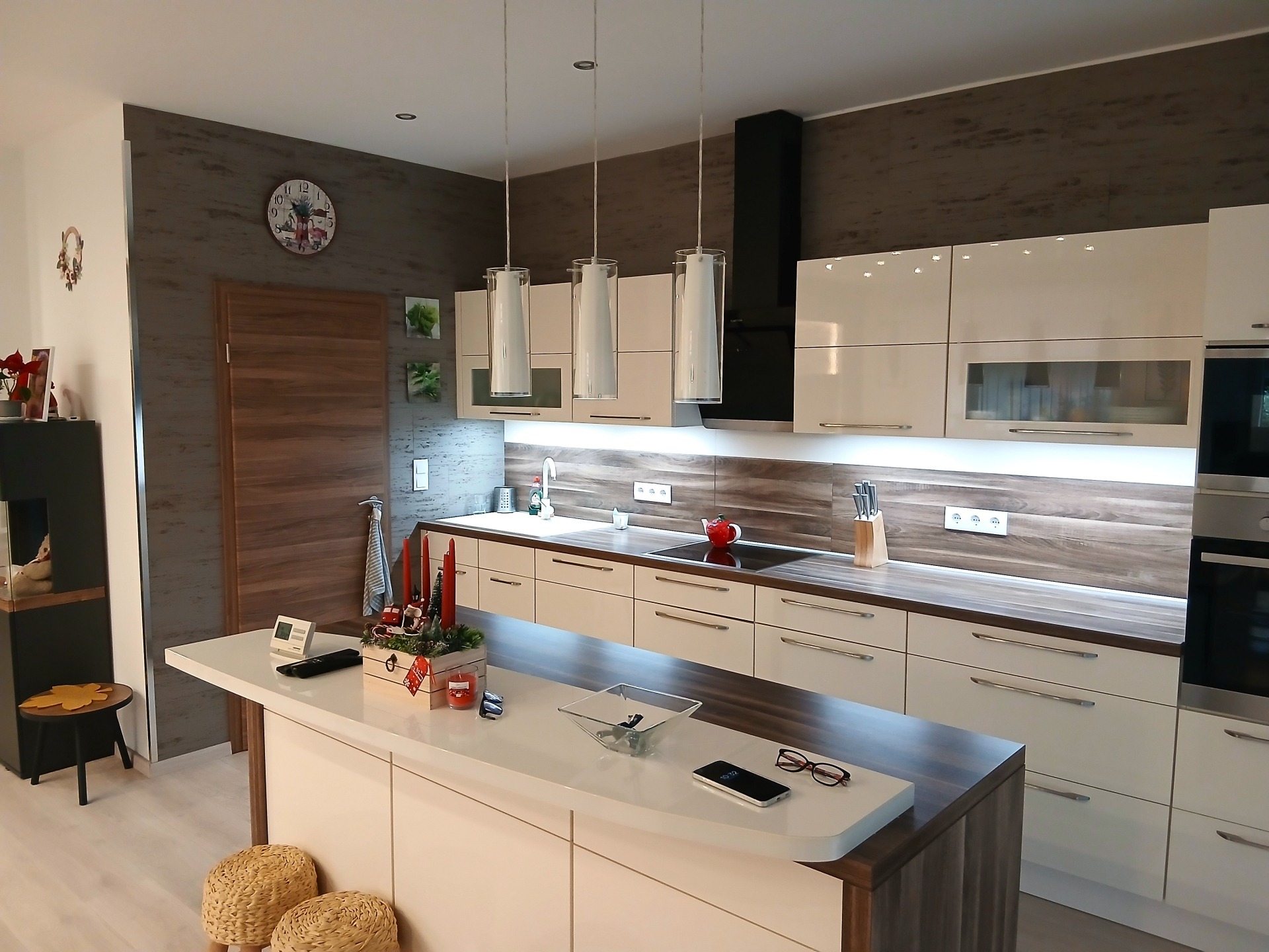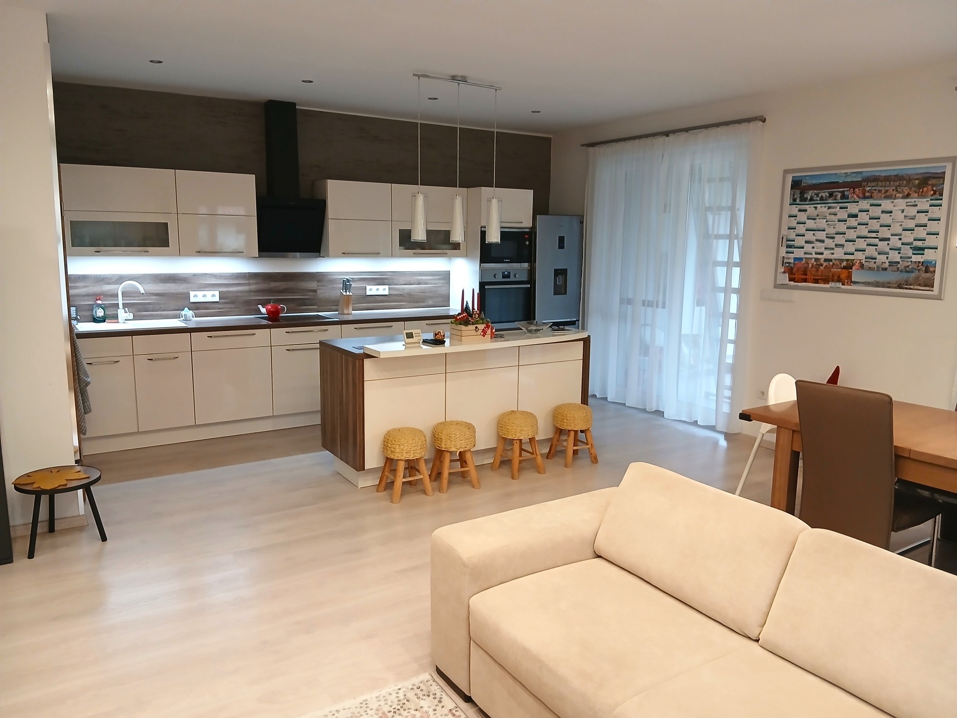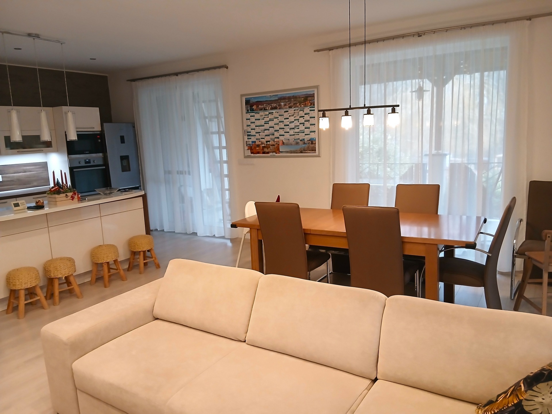 - napfényes amerikai konyha–étkező–nappali, konyhaszigettel, modern gépekkel
